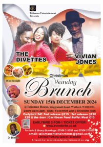 Welcome DRINK ON ENTRY.. RAFFLE TICKETS.. to **CHRISTMAS SUNDAY BRUNCH** with **VIVIAN JONES** and **THE DIVETTES** on the 15th of December! Join us for a festive afternoon filled with delicious food, great music, and holiday cheer. The event will start at 2:00 PM at the location WD18 0FL. Don’t miss out on this opportunity to celebrate the season with friends and family. See you there!